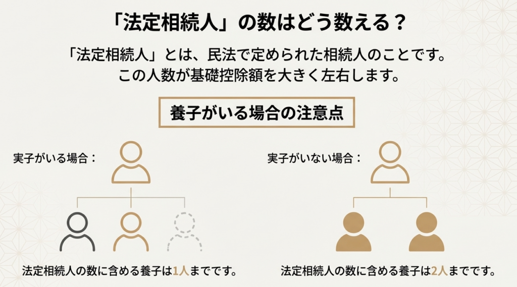 この計算式にある「法定相続人の数」をカウントする際には、特に養子がいる場合に注意が必要です。以下のルールが定められています。