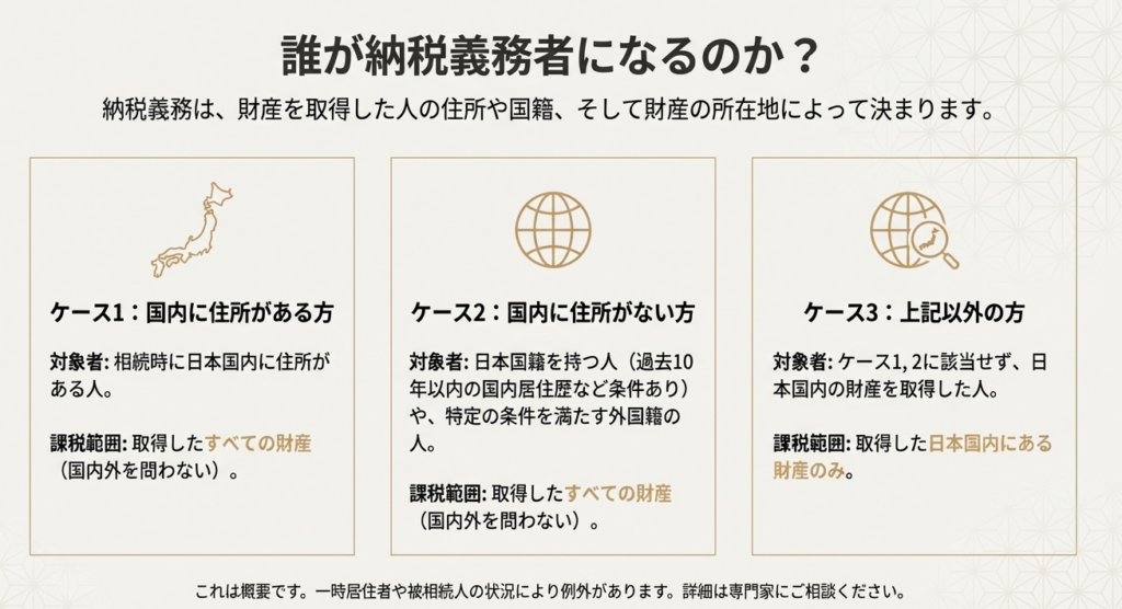 最後に、誰が納税義務を負うのか、そしてどの範囲の財産が課税対象となるのかを確認します。この点は、財産を取得した人の住所地や国籍によって扱いが異なるため、細心の注意が必要です。