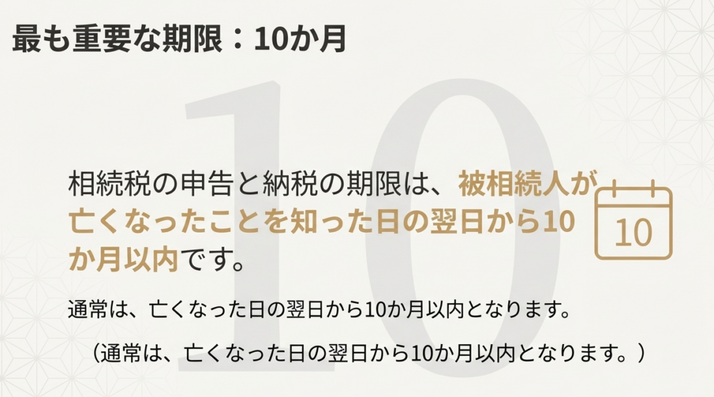 相続税の申告と納税には、厳格な期限が設けられています。それは、被相続人の死亡したことを知った日の翌日から「10か月以内」です。この期限は、クライアントへの説明はもちろん、我々の業務スケジュール管理においても極めて重要です。絶対に忘れないでください。