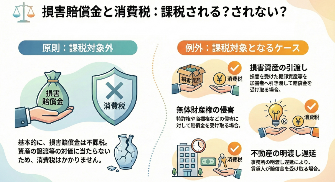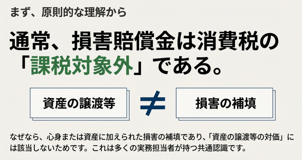 損害賠償金は、心身または資産に加えられた損害の発生に伴って受け取るものであり、通常は消費税における資産の譲渡等の対価には当たらないとされています。したがって、原則として課税の対象とはなりません。