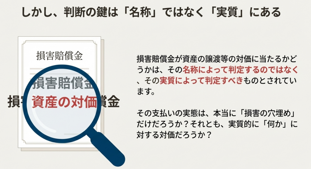 最も重要な基準は、その金銭の「名称」ではなく、「実質」です。損害賠償金という名称であっても、その実質が資産の譲渡や貸付けの対価であると判断される場合には、課税対象となります。