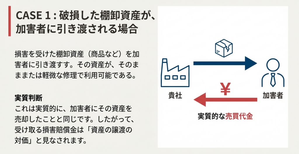 分析: この取引の最大のポイントは、引き渡される商品が依然として資産価値を有している点です。まだ使用可能な商品を相手に引き渡している以上、その実質は、損害を受けた商品を、その現状の価値で加害者に対して売却したことに他なりません。受け取った損害賠償金は、実質的には「損壊した商品の売却代金」です。資産の引き渡しという明確な「対価性」が存在するため、課税対象の売上となります。
