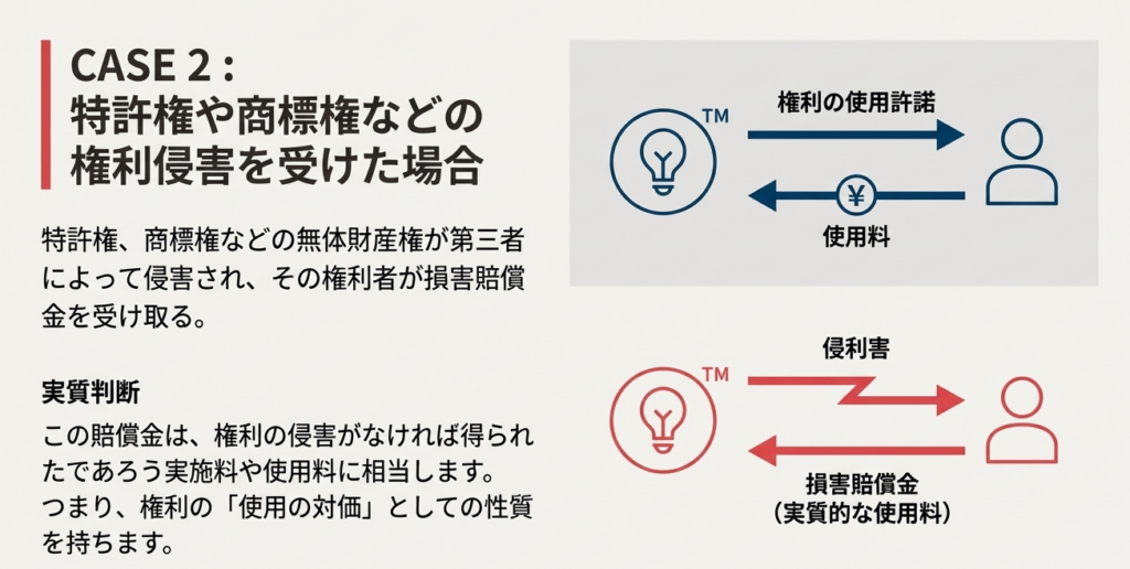 分析: この場合、受け取った損害賠償金は、結果的に「権利の不正使用に対する使用料」としての性格を持ちます。本来であればライセンス契約を結び、正当な使用料(ライセンス料)として受け取るべき金銭を、損害賠償という形で回収しているに過ぎません。権利の使用を許諾したことに対する対価と見なされるため、課税対象となります。