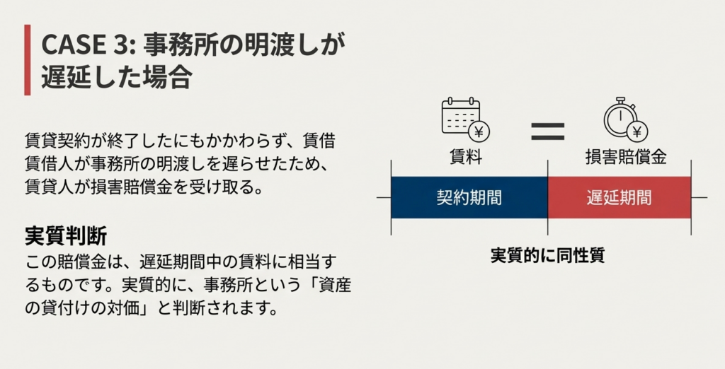 分析: この損害金は、実質的には「契約期間を超えて事務所を使用したことに対する追加の賃料」と解釈されます。事務所という資産を継続して使用させた(貸し付けた)ことへの対価として金銭を受け取っているため、その経済的実態は賃貸借契約の延長と変わりません。したがって、この損害金は課税の対象となります。
