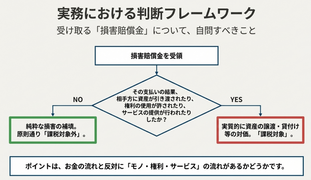 ただし、最も重要なのは、その金銭の名称が「損害賠償金」であったとしても、その実質が資産の譲渡やサービスの提供に対する対価であると認められる場合には、消費税の課税対象となる、という点です。税務判断においては、形式的な名称ではなく、その取引の経済的な実態が問われます。