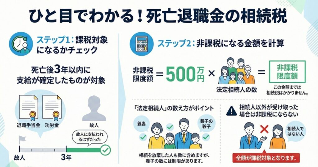 ここでは、①何が「相続財産とみなされる退職手当金等」に該当するのか、②「非課税限度額」はどのように計算するのか、そして③最終的な「課税価格」はどのように決まるのか、という3つのステップに分けて具体的に解説していきます。