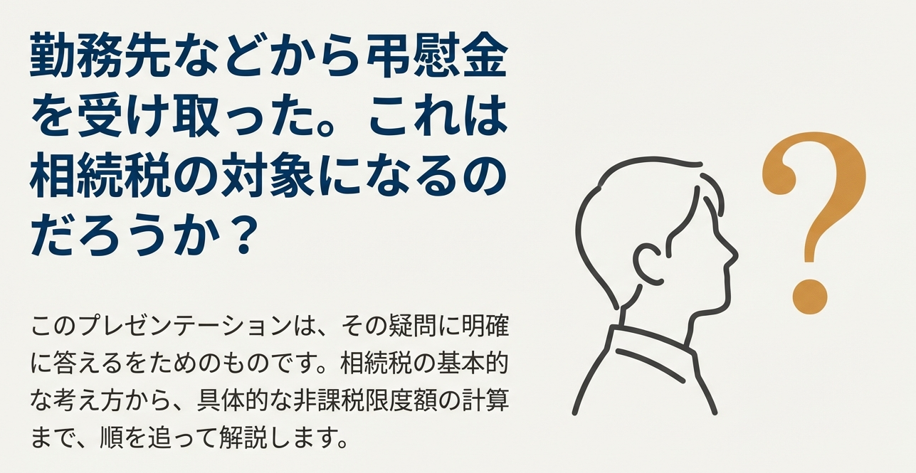 事務所へようこそ。これから皆さんが相続税の実務に携わる上で、頻繁に直面する項目の一つに「弔慰金」があります。ご遺族が故人の勤務先などから受け取るこの弔慰金は、一見すると非課税で単純なものに見えるかもしれません。同様に、社会通念上相当と認められる花輪代や葬祭料なども、原則として課税の対象にはなりません。