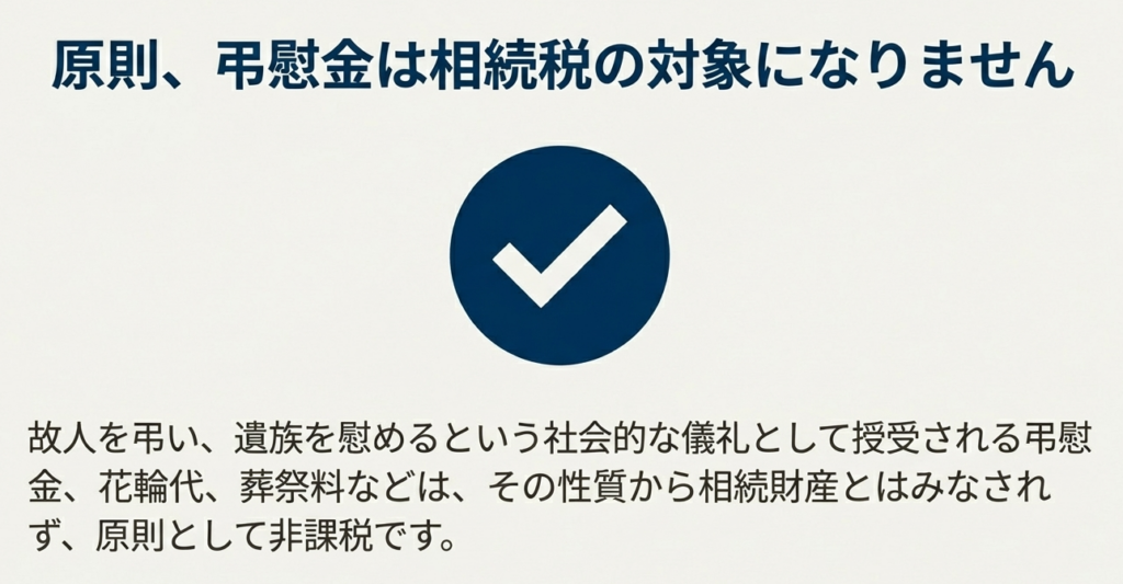 いいえ、原則として相続税の対象にはなりません。被相続人の死亡によって受け取る弔慰金、花輪代、葬祭料などは、通常、相続税の課税対象外とされています。