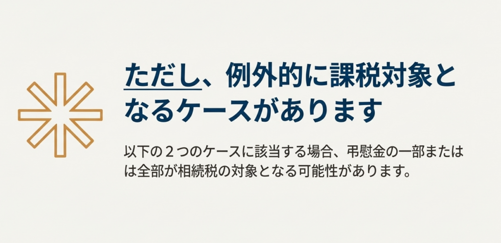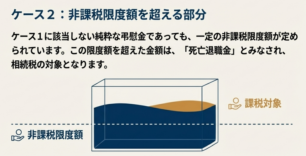 弔慰金が非課税限度額を超えた場合、その超過部分は退職手当金等として扱われ、相続税の課税対象となります。