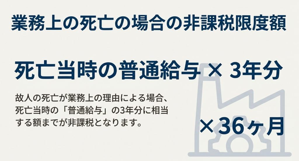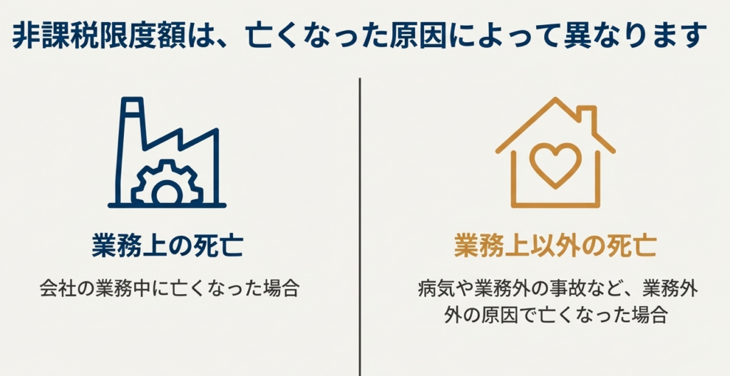 ステップ1で退職手当金等に該当しないと判断された部分(純粋な弔慰金)については、次に非課税限度額を計算します。この限度額は、被相続人の死亡が「業務上のものか、そうでないか」によって、以下の通り明確に区分されています。