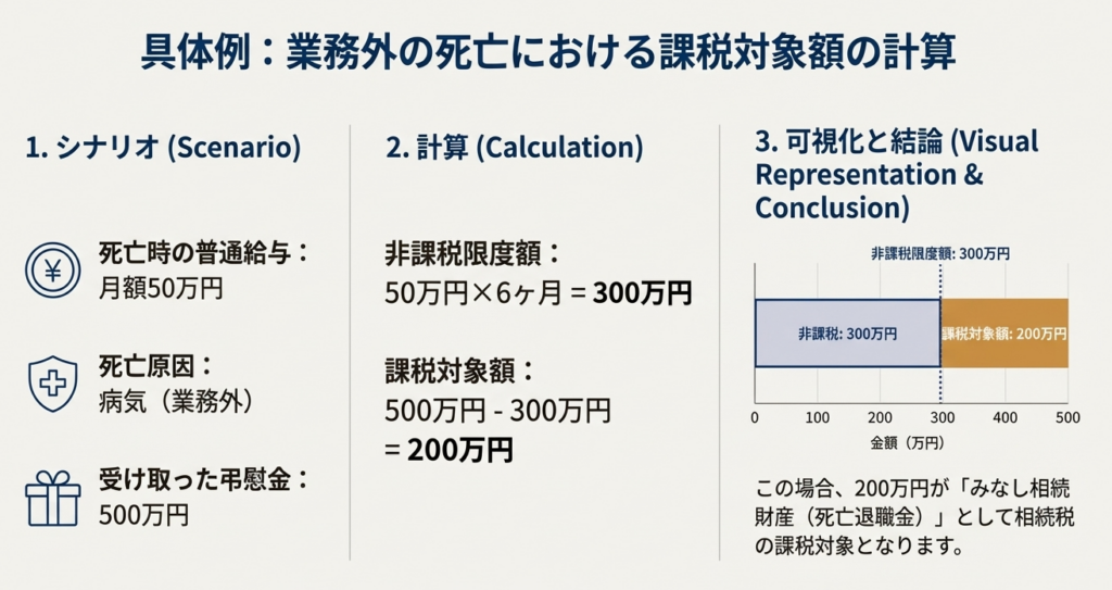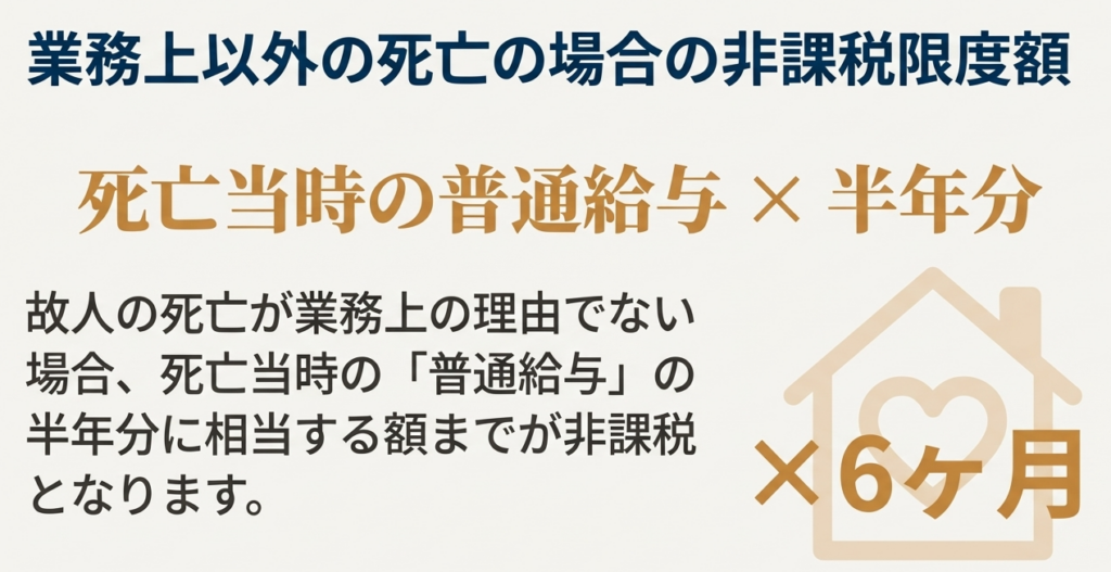 この非課税限度額は、被相続人の死亡当時の普通給与(俸給、給料、賃金などの合計額)に基づいて計算されます。具体的には、死亡が業務上の死亡である場合は普通給与の3年分業務上の死亡でない場合は半年分に相当する額です。