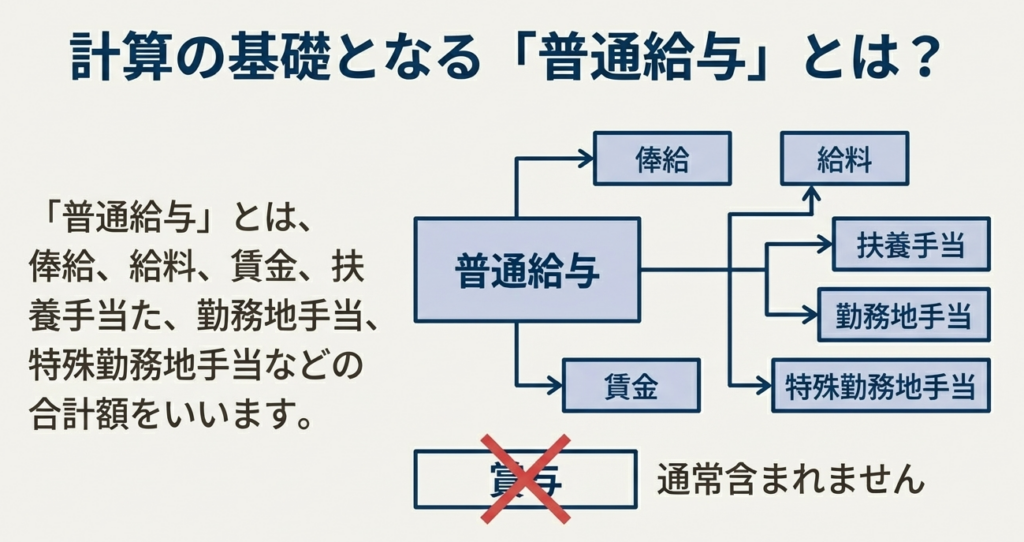 ここで注意すべきは、「普通給与」という言葉の定義です。これは単なる基本給を指すものではありません。