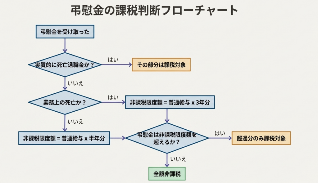 最初に、その弔慰金が実質的に退職手当金等に該当しないかを確認し、次に、純粋な弔慰金と認められる部分について非課税限度額を計算します。この手順を正確に理解することが、適切な申告とクライアントへの説明責任を果たす上で極めて重要になります。
