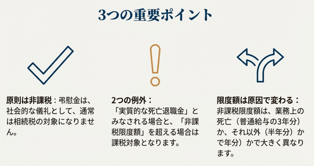 まず、結論からお伝えします。弔慰金の税務上の取扱いには、明確な原則と例外があります。