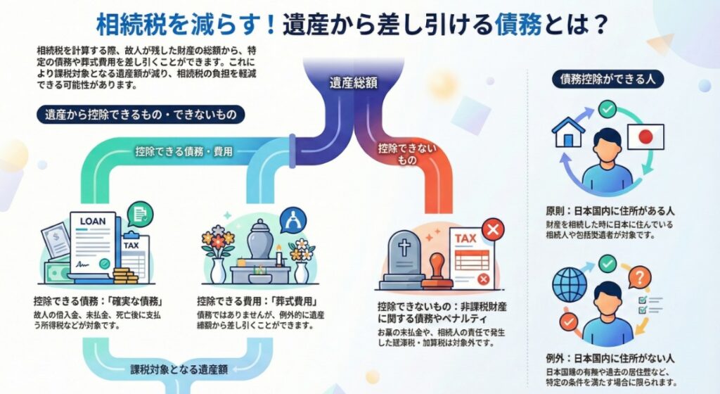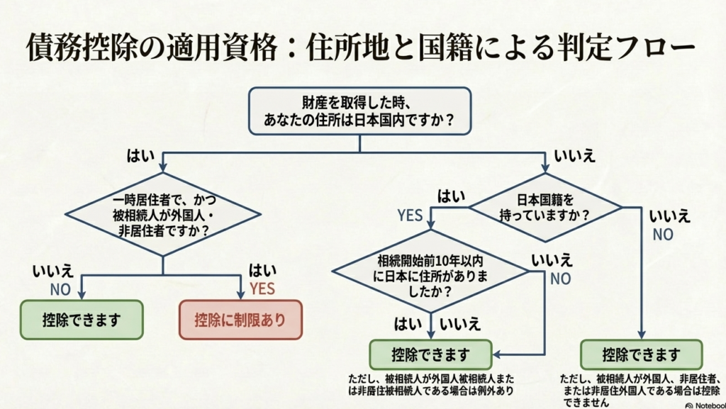 相続時に日本国内に住所がある人は、原則として債務控除を受けることができます。ただし、その人が一時居住者であり、かつ被相続人が外国人被相続人または非居住被相続人である場合は除かれます。
