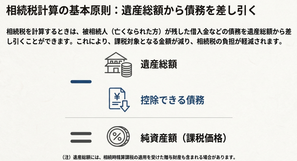 相続税計算における債務控除の最終的な目的は、被相続人が実質的に遺した純資産を算出し、それに基づいて課税対象となる遺産総額を正しく算定することにあります。この目的を達成するため、法律では遺産総額から以下の項目を差し引くことが認められています。