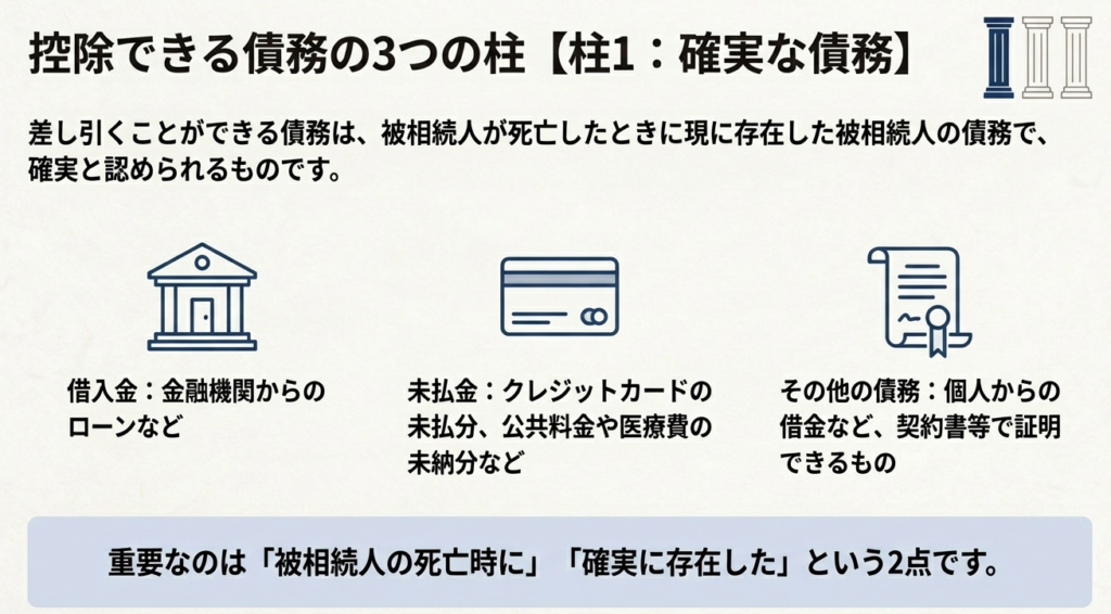 相続財産から差し引くことができる債務には、明確な要件があります。それは、「被相続人が死亡したときに現に存在」し、かつ「確実と認められるもの」であるという2つの条件を満たすことです。借入金や各種サービスの未払金などが典型例です。