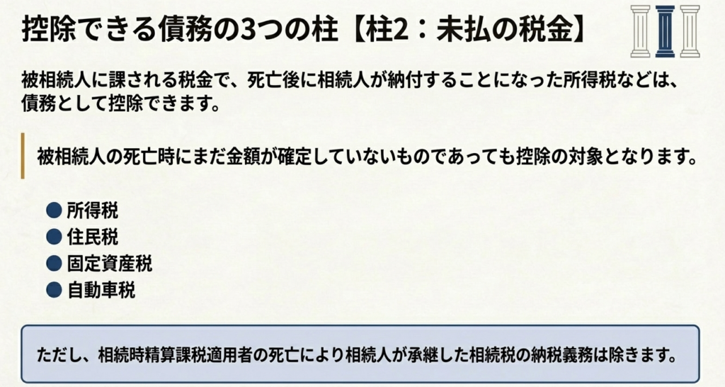 問2: 被相続人が死亡した時点では確定していなかった税金も、債務として控除できる場合があります。具体的にどのような税金が該当しますか?