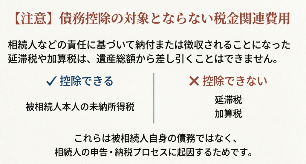 相続人の責任に基づいて発生した延滞税や加算税などは、控除の対象にはなりません。これらは、あくまで相続人の申告・納税義務の履行状況に起因するペナルティだからです。
