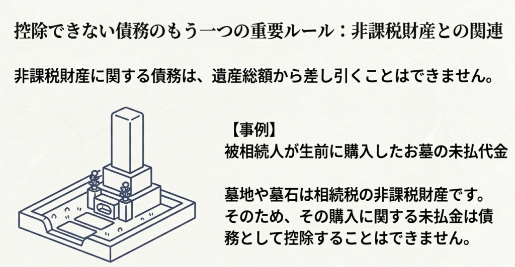 例えば、被相続人が生前に購入したお墓の代金が未払いだったとします。祭祀財産であるお墓そのものは相続税の非課税財産です。このルールは「二重の利益」が生じるのを防ぐためのものです。つまり、非課税でお墓という財産を取得した上で、その購入にかかった未払金を他の課税対象財産から差し引くことまで認めてしまうと、課税の公平性を著しく損なうことになります。そのため、このような債務の控除は認められていません。