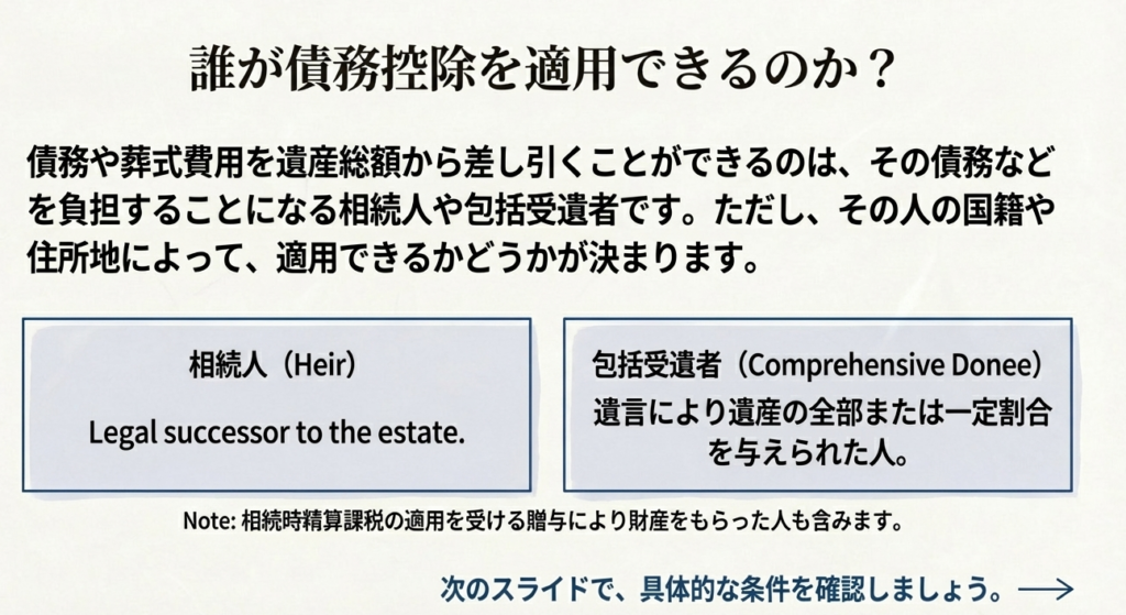 債務控除は、誰でも無条件に適用できるわけではありません。その債務を負担することになる相続人や包括受遺者(相続時精算課税の適用を受ける贈与により財産をもらった人を含みます。)のうち、以下の要件を満たす人のみが対象となります。