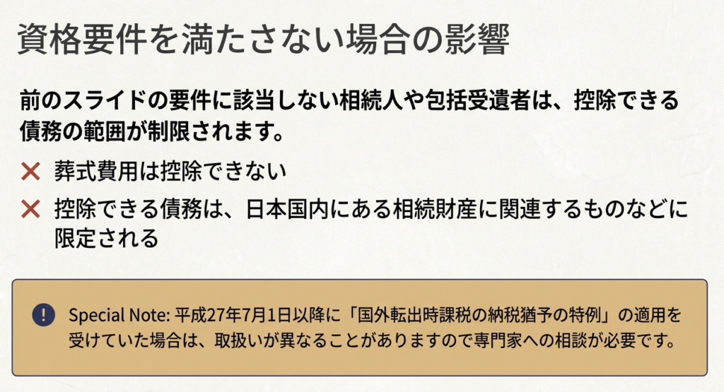 所定の居住地や国籍などの要件に該当しない場合、遺産総額から控除できる債務の範囲が限定されます。さらに、葬式費用については控除することができなくなります。