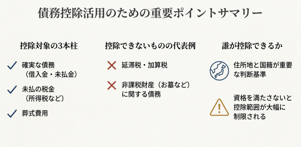 そこで本稿では、まず結論として相続財産から何を差し引けるのか全体像を掴み、その後に各項目の詳細なルールと実務上の注意点を解説していきます。