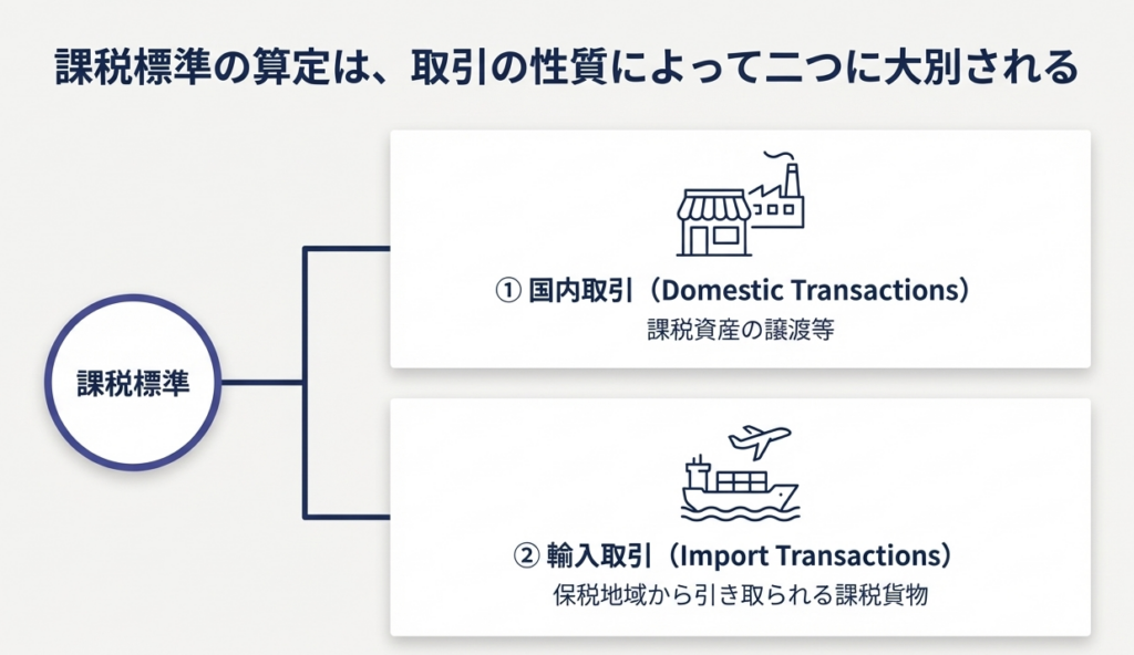 商品を輸入する場合の課税標準は、国内取引のルールとは全く異なります。これは、消費税が「国内における消費」に対して課される税であるという本質に基づいています。そのため、輸入品については、国内市場に入ってくる時点(=保税地域から引き取る時点)での価値を基準に課税するという考え方が採られています。