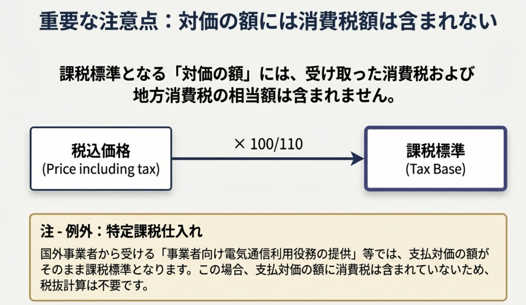 受け取った対価の額(消費税等を含まない税抜きの金額)が課税標準となります。請求書に記載された総額ではなく、本体価格が基準であると覚えてください。