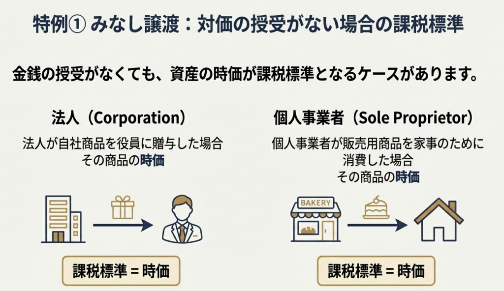特定の取引では、通常の対価の額とは異なる金額が課税標準とされます。例えば、法人が自社商品を役員に贈与したり、個人事業者が商品を家庭で使用したりした場合は、その商品などの時価が対価の額と見なされます。