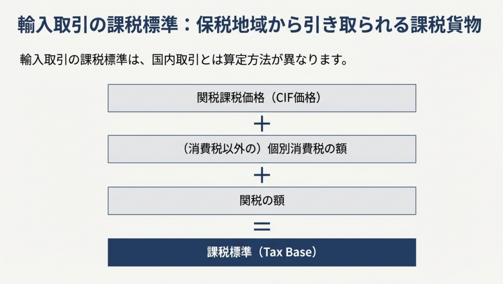 保税地域から引き取られる課税貨物の課税標準は、「関税課税価格(CIF価格)」に、消費税以外の「個別消費税の額」と「関税の額」を加算した合計額です。