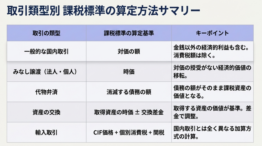 通常の対価がない「みなし譲渡」のように客観的な「時価」が基準となるケースや、海外からの「輸入取引」のように関税課税価格(CIF価格)などを基に計算する全く異なるルールが適用されるケースが存在します。