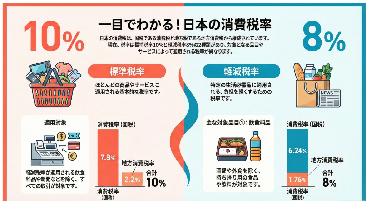 日本の消費税は、消費者が負担する消費税と地方消費税の合計額であり、標準税率10%軽減税率8%の複数税率が適用されています。これらの税率は、原則として令和元年10月1日以後の取引に適用されています。