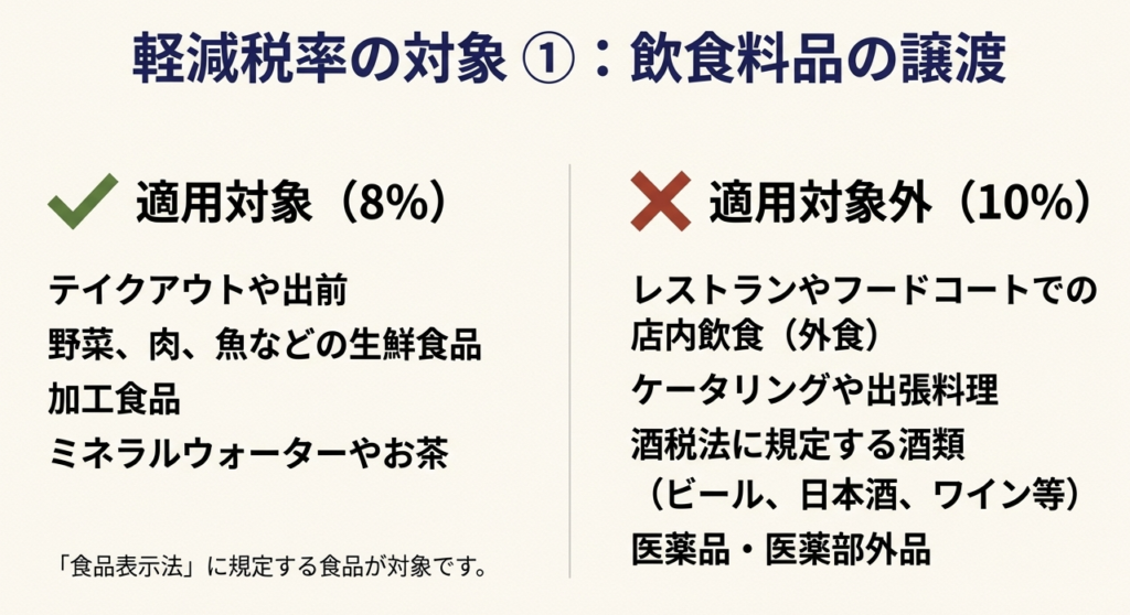 軽減税率(8%)は、特定の品目に限定して適用される例外的な措置です。対象となる品目は、以下の2つに大別されます。