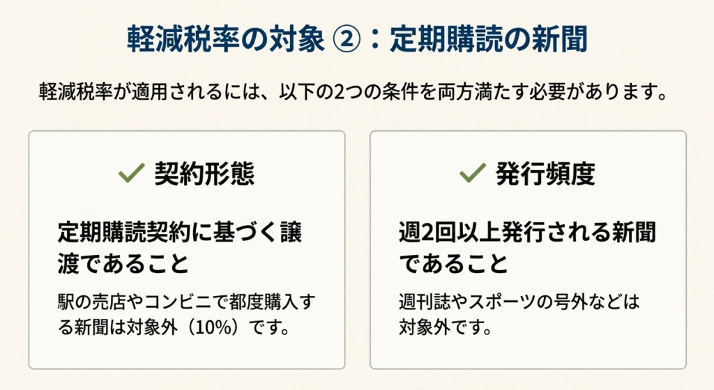 すべての新聞が対象となるわけではなく、「定期購読契約が締結」され、「週2回以上発行される」ものに限られます。駅の売店などで購入する新聞は軽減税率の対象外です。