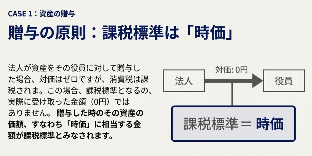 法人が役員に資産を贈与した場合、それは対価を得て行う資産の譲渡とみなされます。このため、課税標準は贈与した時のその資産の価額、すなわち「時価」に相当する金額となります。