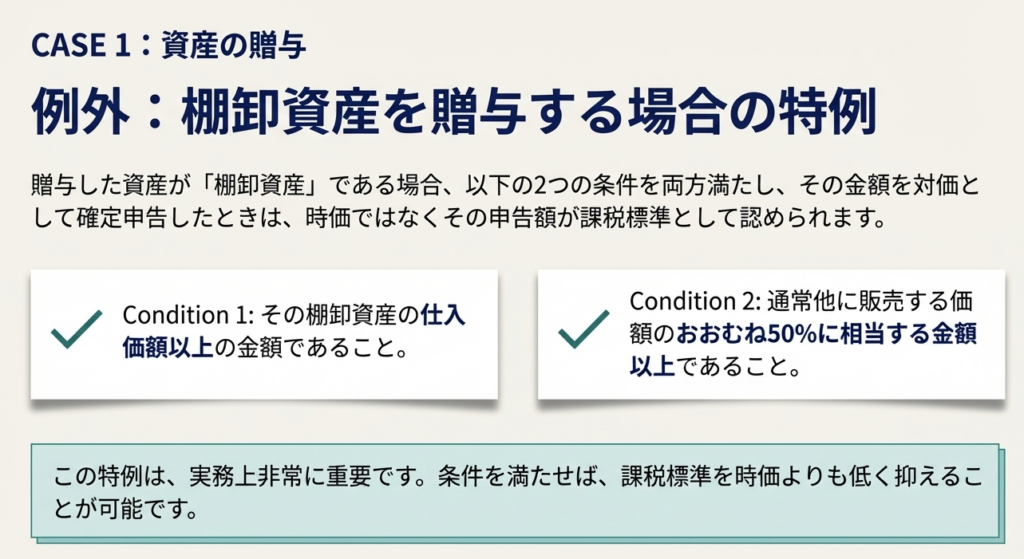 ただし、この原則には実務上重要な例外が存在します。贈与した資産が棚卸資産(商品や製品など)両方とも満たす金額を対価として確定申告したときは、その処理が認められます。