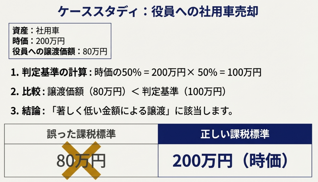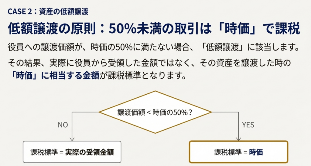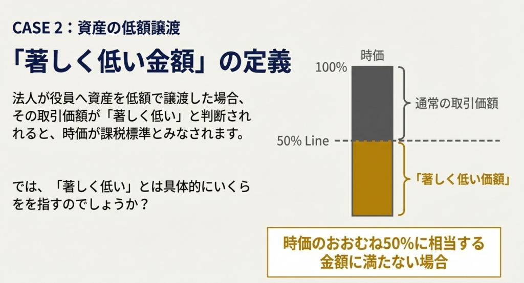 まず、「著しく低い金額」とは、その資産の時価のおおむね50%に相当する金額に満たない金額を指します。この基準に該当する低額譲渡が行われた場合、課税標準は実際に受け取った金額ではなく、その資産の時価となります。つまり、時価100万円の資産を30万円で役員に譲渡した場合、課税標準は30万円ではなく100万円となります。