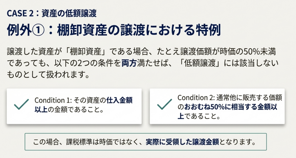 譲渡した資産が棚卸資産である場合、その譲渡価額が「著しく低い金額」に該当しないケースがあります。具体的には、以下の2つの条件を両方とも満たす場合、その取引は低額譲渡には該当しないものとして扱われ、実際に受け取った譲渡金額がそのまま課税標準となります。