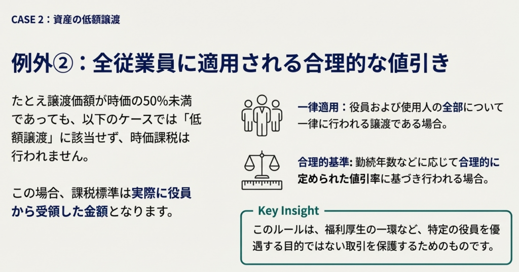 役員個人に対する特別な取引ではなく、福利厚生の一環として行われる割引販売などは、特例の対象となります。役員および使用人のすべてに対して、勤続年数など合理的な基準で定められた値引率に基づいて譲渡が行われた場合は、その譲渡価額が時価の50%未満であったとしても、実際に受領した金額が課税標準として認められます。