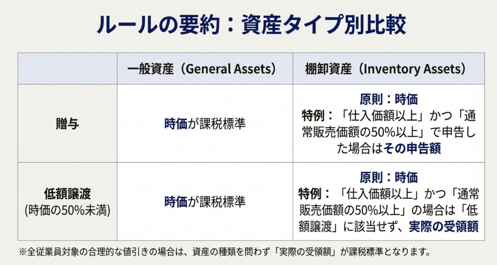 ただし、贈与または低額譲渡の対象が棚卸資産である場合、その仕入価額以上の金額であり、かつ、通常他に販売する価額のおおむね50パーセント以上の金額を対価として確定申告(または譲渡)したときは、例外的な取り扱いが認められます。また、役員・使用人全員一律に合理的な値引率で行う譲渡は、実際に受領した金額で課税されます。