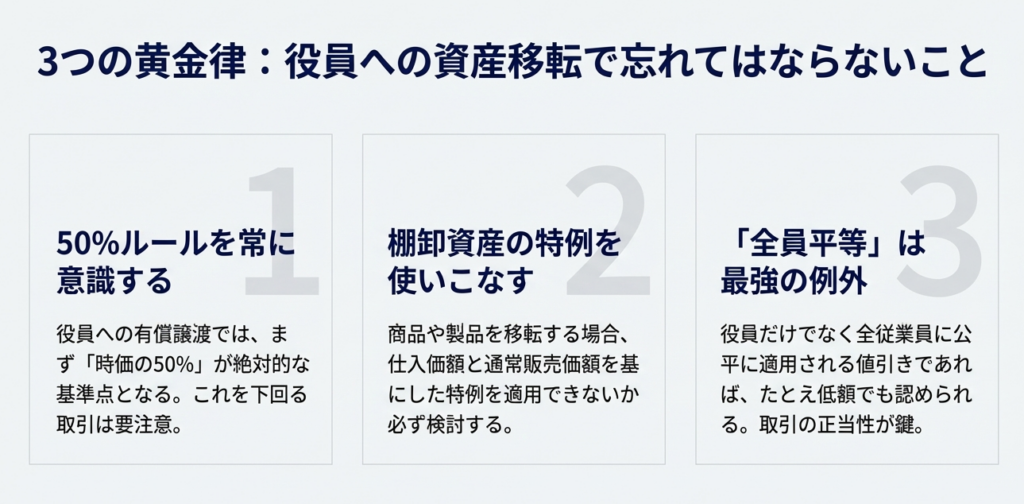自社製品や在庫品などを役員に贈与・販売する際には、棚卸資産の特例が適用できるか否かを必ず検討してください。「仕入価額」と「通常販売価額の50%」という2つの基準を常に意識し、どちらの条件も満たす価格設定になっているかを確認する習慣が重要です。