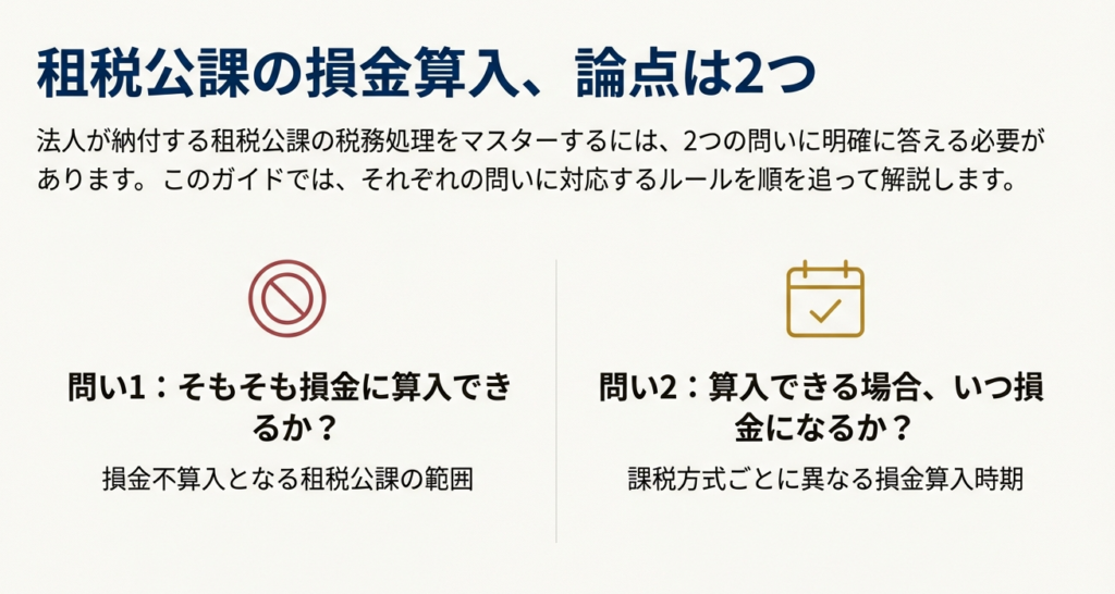 租税公課の税務処理をマスターするには、突き詰めると2つの問いに答えることがすべてです。それは**「そもそも、その税金は損金に算入できるのか?」そして「できるとしたら、いつの事業年度に算入すべきか?」**という問いです。ここでは詳細に入る前に、この2つの問いに対する結論を明確に示します。