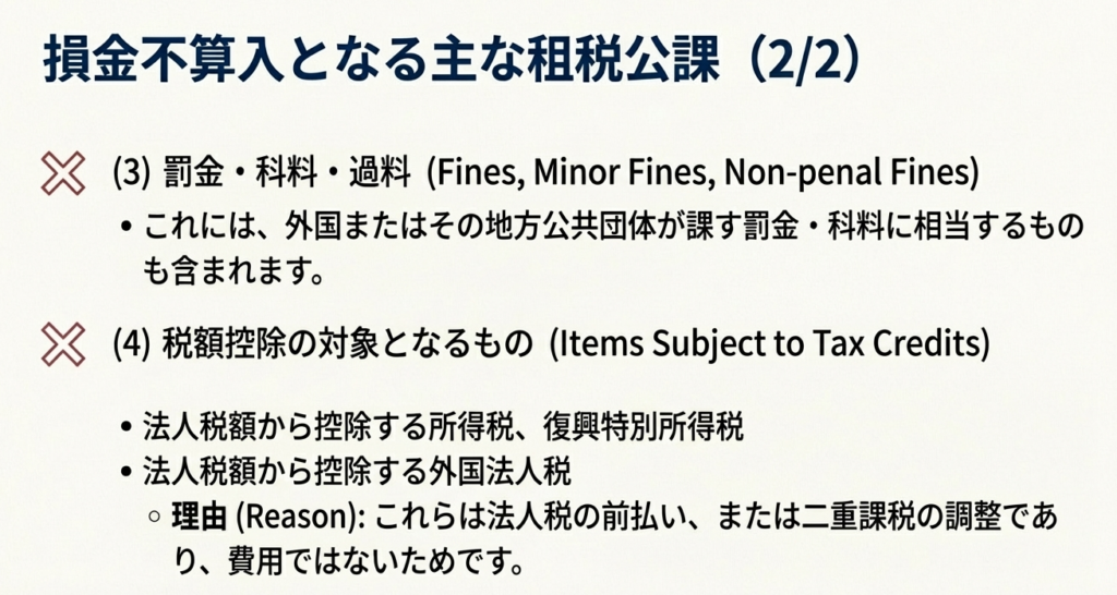 罰金および科料は損金の額に算入されません。これには、外国またはその地方公共団体が課する罰金または科料に相当するものも含まれます。