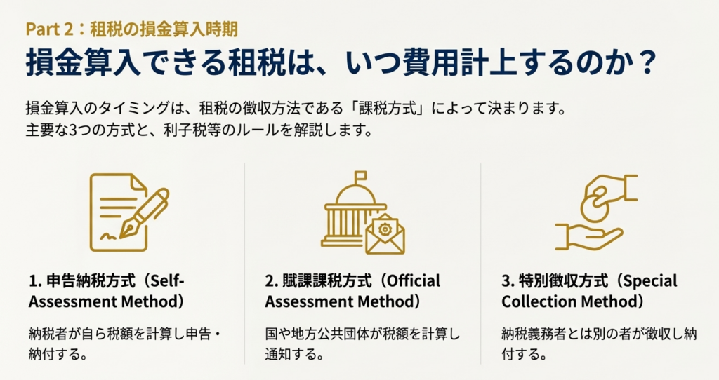 損金算入が認められる租税については、その算入時期が重要になります。このタイミングは、主にその税金の「納税方式」によって決まります。ここでは主要な3つの方式と、利子税等について解説します。