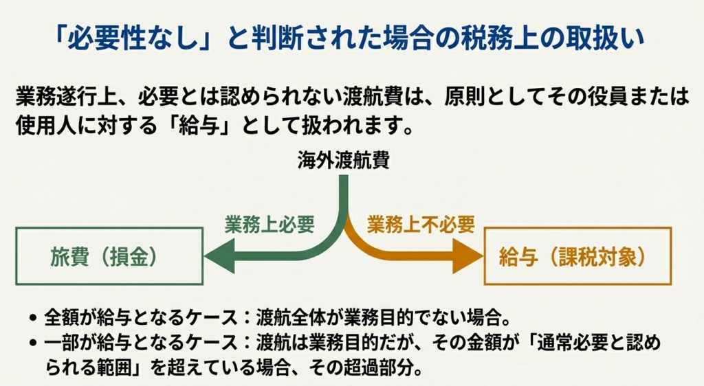 問2: 業務上必要と認められる海外渡航であっても、旅費が「通常必要と認められる金額」を超えた場合、その超過分は税務上どのように扱われますか?