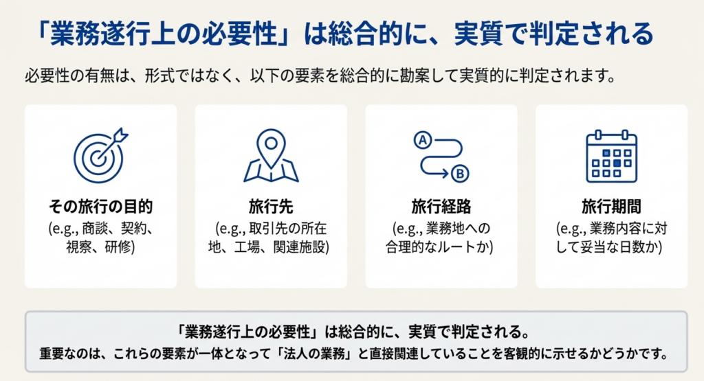 税務上の判断において、「業務遂行上の必要性」は、旅行の名目や形式ではなく、その実質で判断されるという点が核心となります。単一の要素だけで判断されるのではなく、あくまでも総合的な観点から、その渡航が真に会社の業務のために行われたものかどうかが問われます。