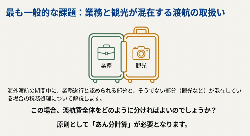 実務において最も頻繁に遭遇し、かつ判断が難しいのが、業務と観光が混在する出張の税務処理です。このようなケースでは、費用の按分ルールを正しく理解し、適用することが適切な経理処理の鍵となります。