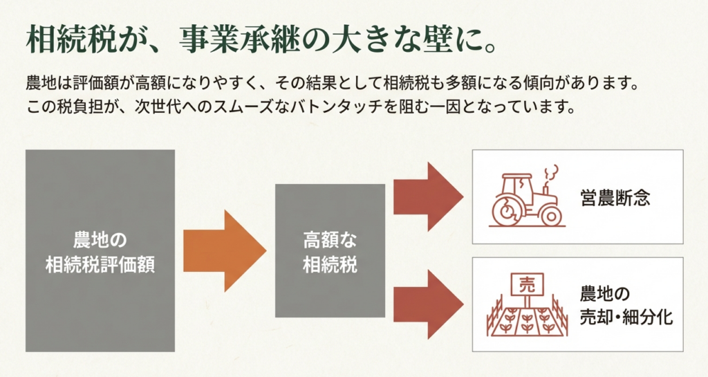 なぜこの制度が我々の業務においてこれほど重要なのでしょうか。それは、日本の農業が直面している深刻な課題に直結しているからです。農地は資産価値が高く、相続が発生すると多額の相続税が課されるケースが少なくありません。