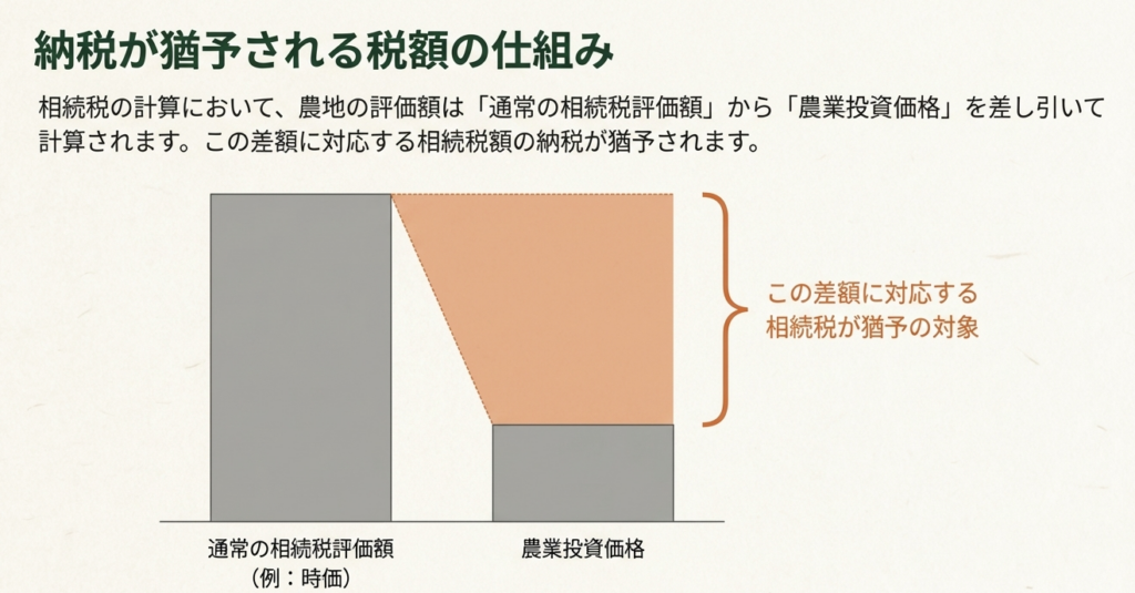 まず、相続した農地の評価額のうち、「農業投資価格」という特別な価格を超える部分に対応する相続税の支払いを「待ってもらえる(猶予される)」ことになります。本来であれば申告期限までに一括で納付すべき多額の相続税の支払いを、農業を続ける限り先延ばしにできる、これが第一の大きな効果です。